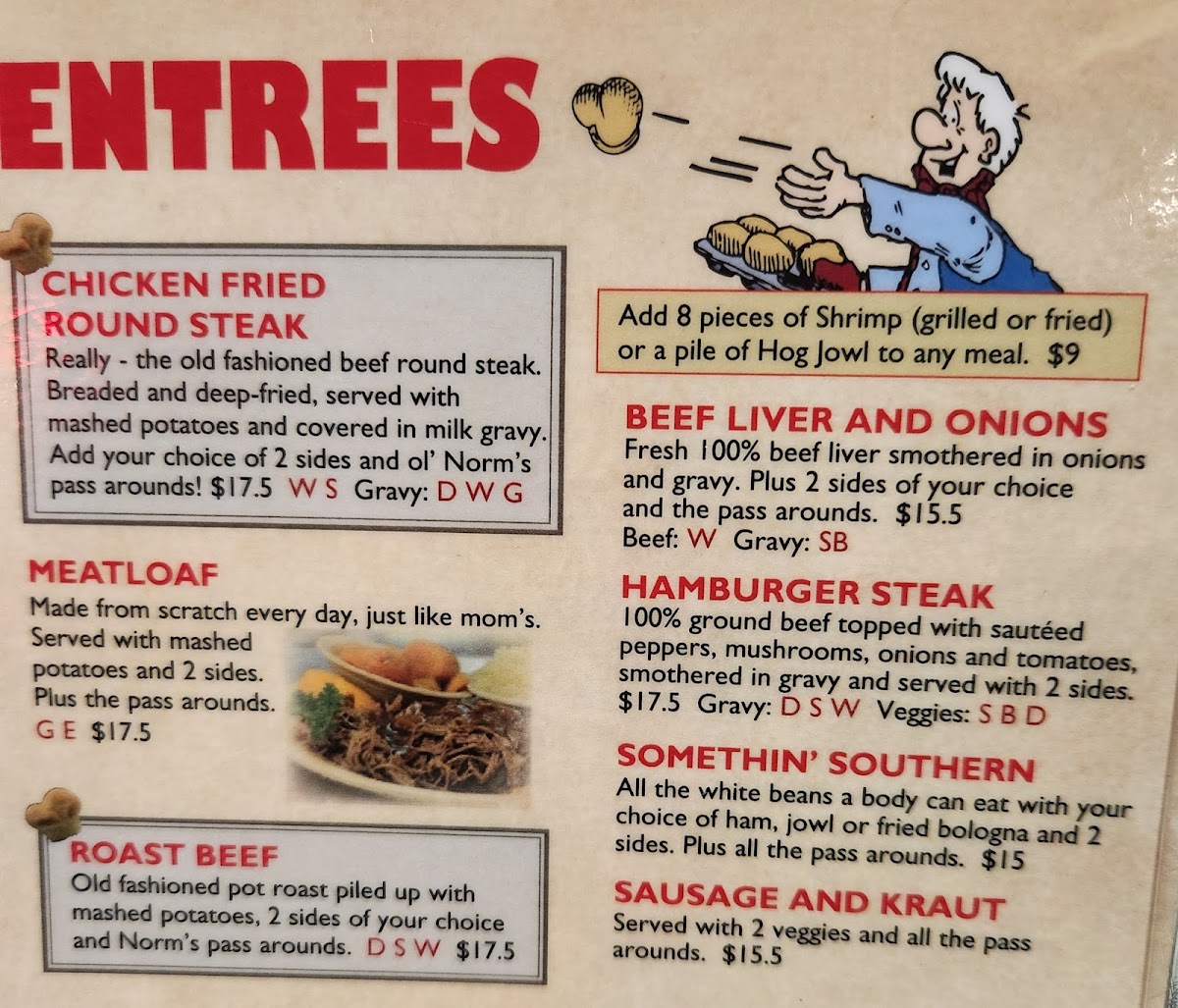 Made from 1/2 pound (8 oz.) of usda choice beef, served with 1 side of your choice - plus ol' norm's pass arounds!